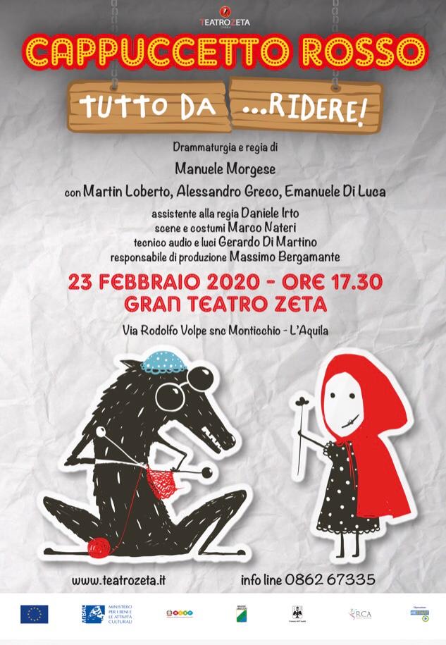 L’AQUILA – La Compagnia TeatroZeta e Zeta Young Company presentano lo spettacolo “Cappuccetto Rosso..tutto da ridere” di Manuele Morgese in Prima Nazionale domenica 23 Febbraio alle 17,30 presso Gran Cinema TeatroZeta al Parco delle Arti di Monticchio.