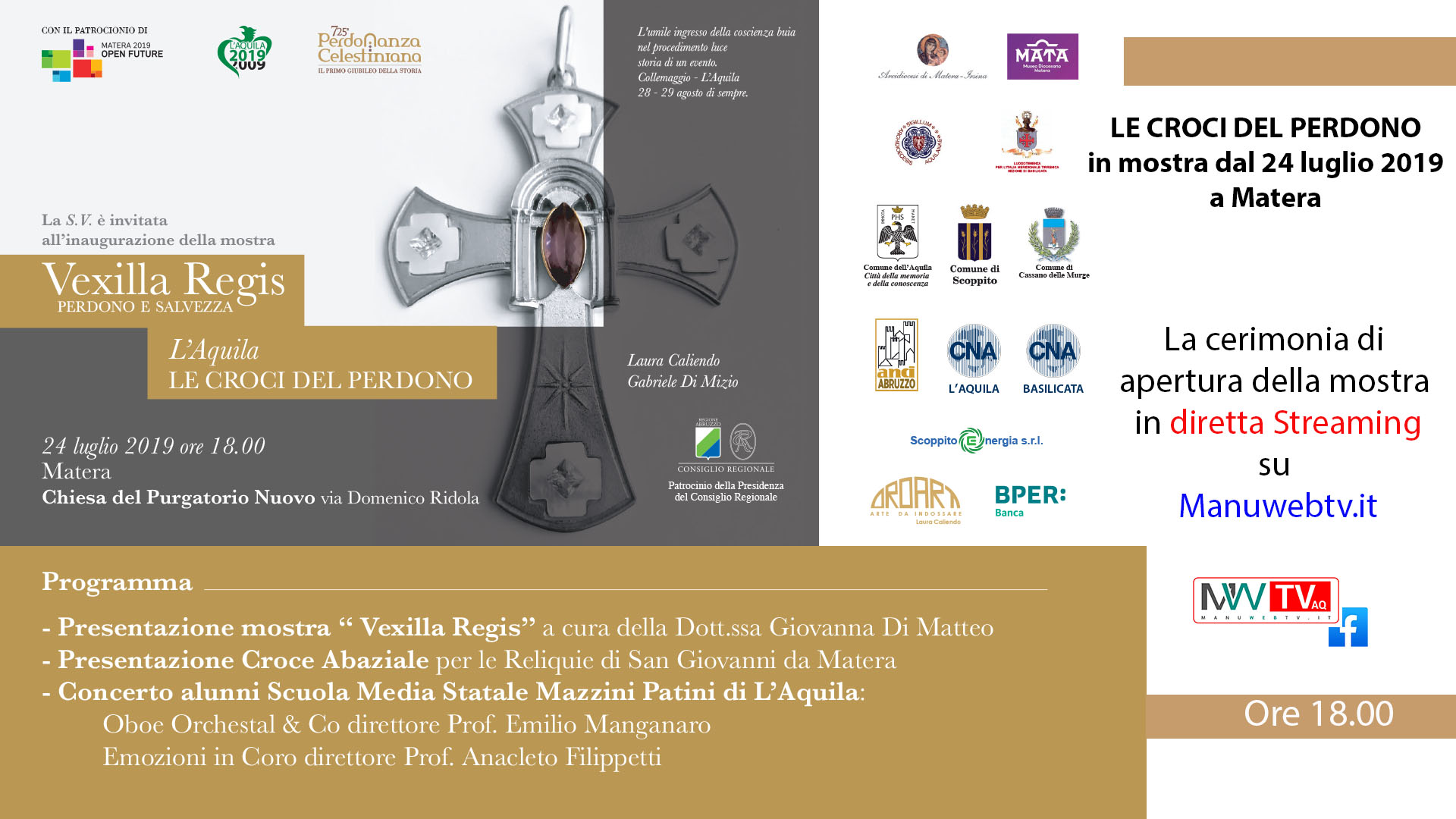 Verrà inaugurata a Matera, il prossimo 24 luglio alle ore 18,00, nella Chiesa del Purgatorio Nuovo, la mostra “Vexilla Regis, Perdono e Salvezza“, che porterà nella città lucana Capitale Europea della Cultura per l’anno 2019 le “Croci del Perdono” realizzate dal 2000 al 2018 dagli artisti-artigiani aquilani Laura Caliendo e Gabriele Di Muzio.