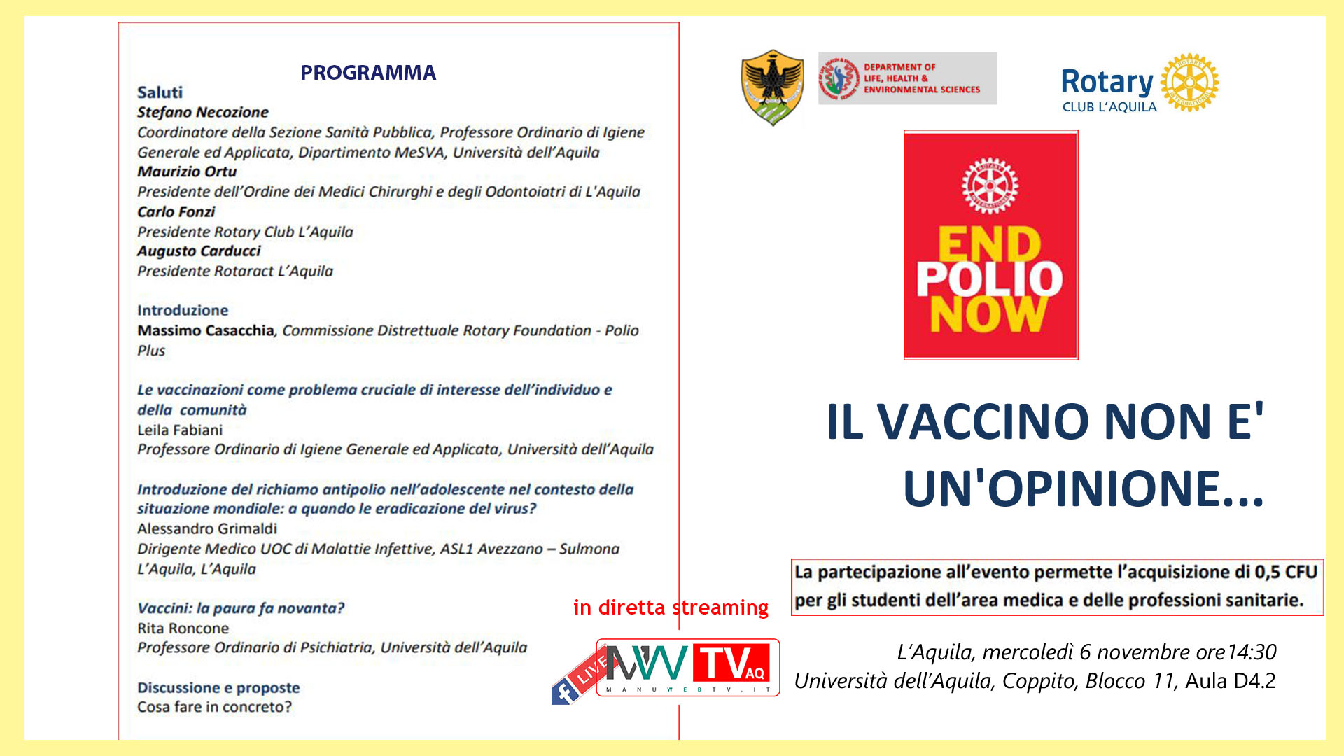 L’Aquila: Nell’ambito delle iniziative per onorare il World Polio Day (24 ottobre) , domani mercoledì 6 novembre ore 14:30 presso l’Università dell’Aquila, Coppito, Blocco 11, Aula D4.2 , il Dipartimento di Medicina clinica, sanità pubblica, scienze della vita e dell’ambiente (MeSVA) e il Rotary Club L’Aquila organizzano un convegno dal titolo “IL VACCINO NON E’ UN’OPINIONE…” per ripercorrere la prodigiosa storia della lotta contro la Polio e il ruolo giocato dal Rotary.