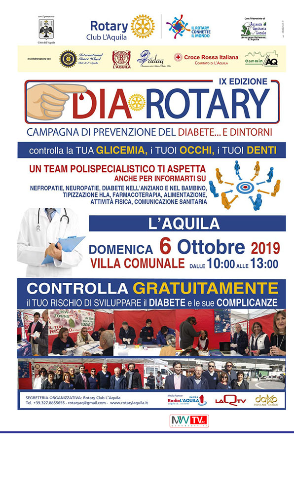 Sempre attento ai bisogni di salute della popolazione, anche quest’anno il Rotary Club L’Aquila, affiancato da Rotaract, Inner Wheel, Associazione ADAQ onlus, Camminaq e Croce Rossa Italiana scende in piazza per una campagna di informazione e prevenzione di questa patologia sistemica e complessa che può condizionare in maniera importante la vita di chi ne è affetto.