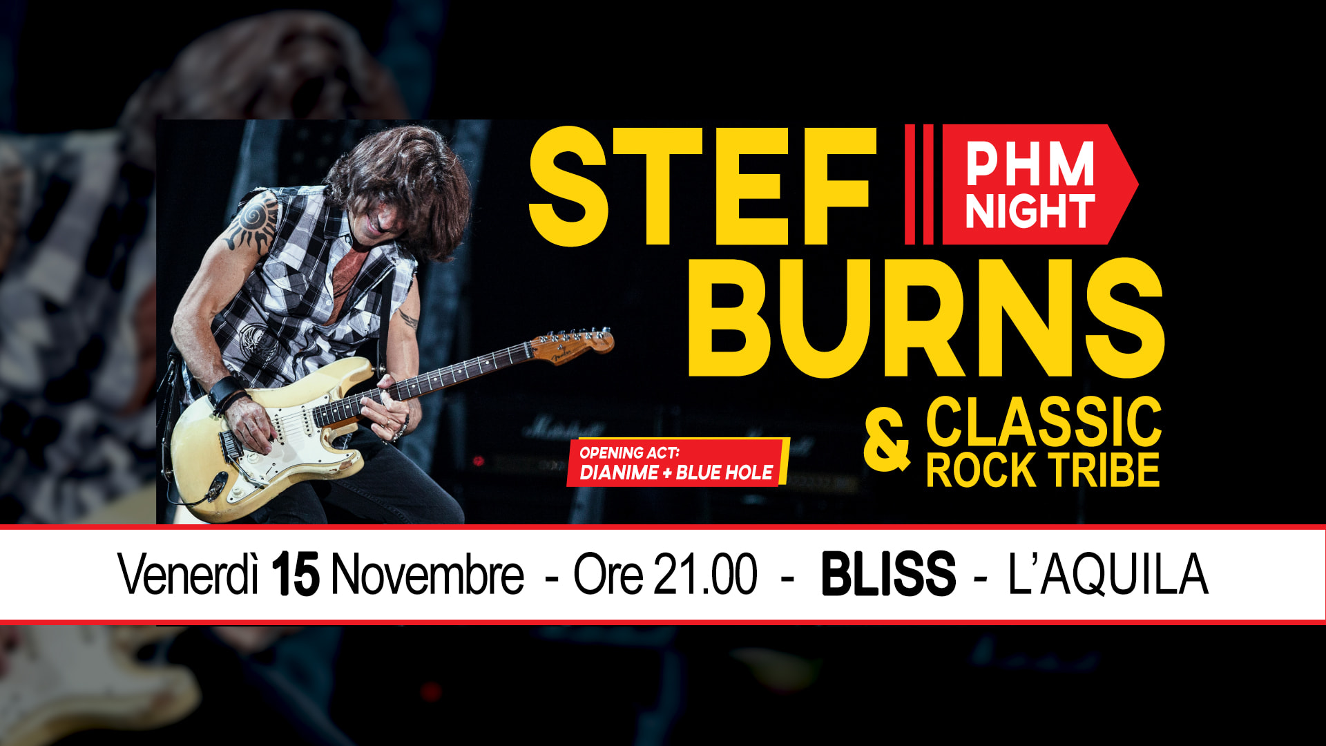 La PHM EVENTS , associazione culturale aquilana di Chiara Masciovecchio e Diego Fiordigigli continua a stupire per la qualità dei suoi eventi come quello del 15 novembre 2019 denominato “Prima PHM NIGHT”, in collaborazione con lo studio di produzione musicale ALTI Records e il negozio di strumenti musicali MUSICA Viva presso la discoteca “Bliss” di Monticchio, il concerto di Stef Burns, il talentuoso chitarrista di Vasco Rossi, in esclusiva per l’Abruzzo.