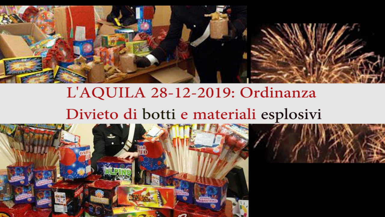 Prevede il divieto “di accensione, lancio e sparo di fuochi d’artificio, mortaretti, petardi e materiale esplosivo di qualsiasi natura” l’ordinanza firmata dal sindaco Pierluigi Biondi e pubblicata sul portale istituzionale del Comune dell’Aquila.
