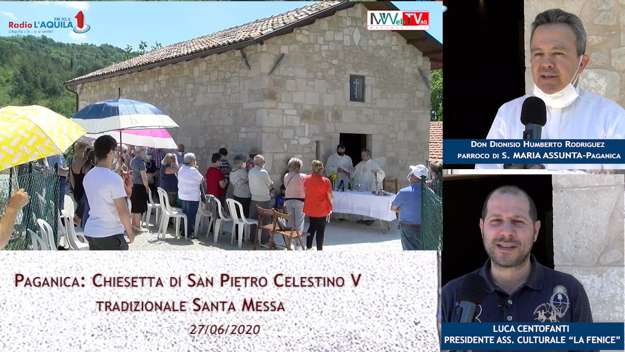 Gran numero dei fedeli (molti giovani) presenti alla chiesetta di S. Pietro Celestino v in via per Pescomaggiore a Paganica , la Santa Messa è stata celebrata all’esterno della stessa viste le ridotte dimensioni del luogo di culto e il doveroso distanziamento sociale previsto dalle norme anti-covid, così come accadde nella stessa circostanza del 2009, a solo qualche mese dal terremoto per i danni riportati, quando un nutrito gruppo di fedeli paganichesi abbandonò le tendopoli recandosi, come consuetudine, nella collina che sale verso il borgo di Pescomaggiore.