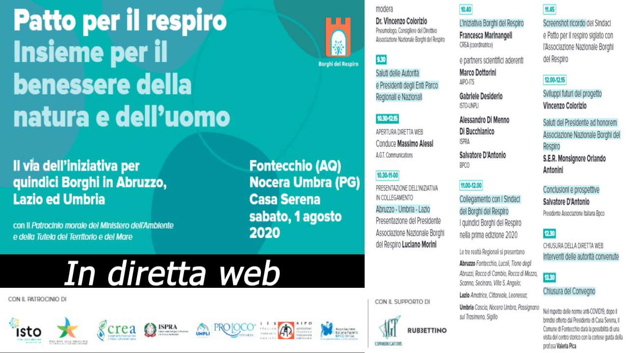 In quell’occasione i primi 15 Comuni italiani aderenti firmeranno il “Patto per il Respiro”, impegnandosi simbolicamente ed effettivamente, nell’ambito dell’Associazione Nazionale Borghi del Respiro, a tutelare la salubrità ambientale, a migliorare lo sviluppo e il turismo sostenibile locali e la vivibilità del borgo, perseguendo l’obiettivo di proteggere la salute e il benessere respiratorio di cittadini ed ospiti e al contempo di promuovere una cultura della salute.