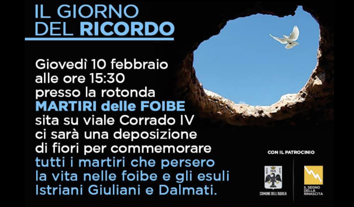 L’Aquila: Il 10 febbraio di ogni anno a partire dal 30 marzo 2004 gli italiani sono invitati a partecipare alla Giornata del Ricordo, con lo scopo di conservare e rinnovare “la memoria della tragedia degli italiani e di tutte le vittime delle foibe, dell’esodo degli istriani, dei fiumani e dei dalmati italiani dalle loro terre durante la seconda guerra mondiale e nell’immediato secondo dopoguerra(1943-1945), e della più complessa vicenda del confine orientale” (legge n.92 2004).