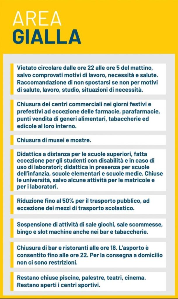 Il tutto in attesa della riunione della cabina di regia per il Monitoraggio Regionale, che verifica i dati epidemiologici sulla base dei 21 parametri. Subito dopo il governo prenderà le sue decisioni.