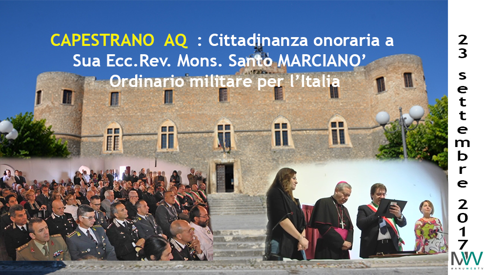 E’ stata una cerimonia molta suggestiva che ha richiamato l’attenzione generale sul borgo di Capestrano. Sabato scorso 23 settembre, infatti, la municipalità nel corso di un Consiglio Comunale Straordinario ha conferito la cittadinanza onoraria a Sua Eccellenza Reverendissima Mons. Santo MARCIANO’ Ordinario militare per l’Italia