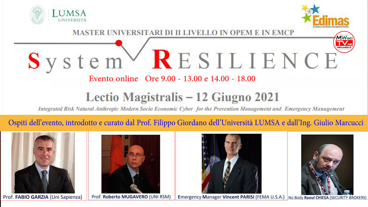 L’Università LUMSA presenta «System Resilience – Integrated Risk Natural Anthropic Modern Socio Economic Cyber for the Prevention Management and Emergency Management», una lectio magistralis organizzata dalla LUMSA Master School e da Edimas nell’ambito delle attività 2020-2021 dei Master in Official of Prevention and Emergency Management e in Emergency Management of Civil Protection.