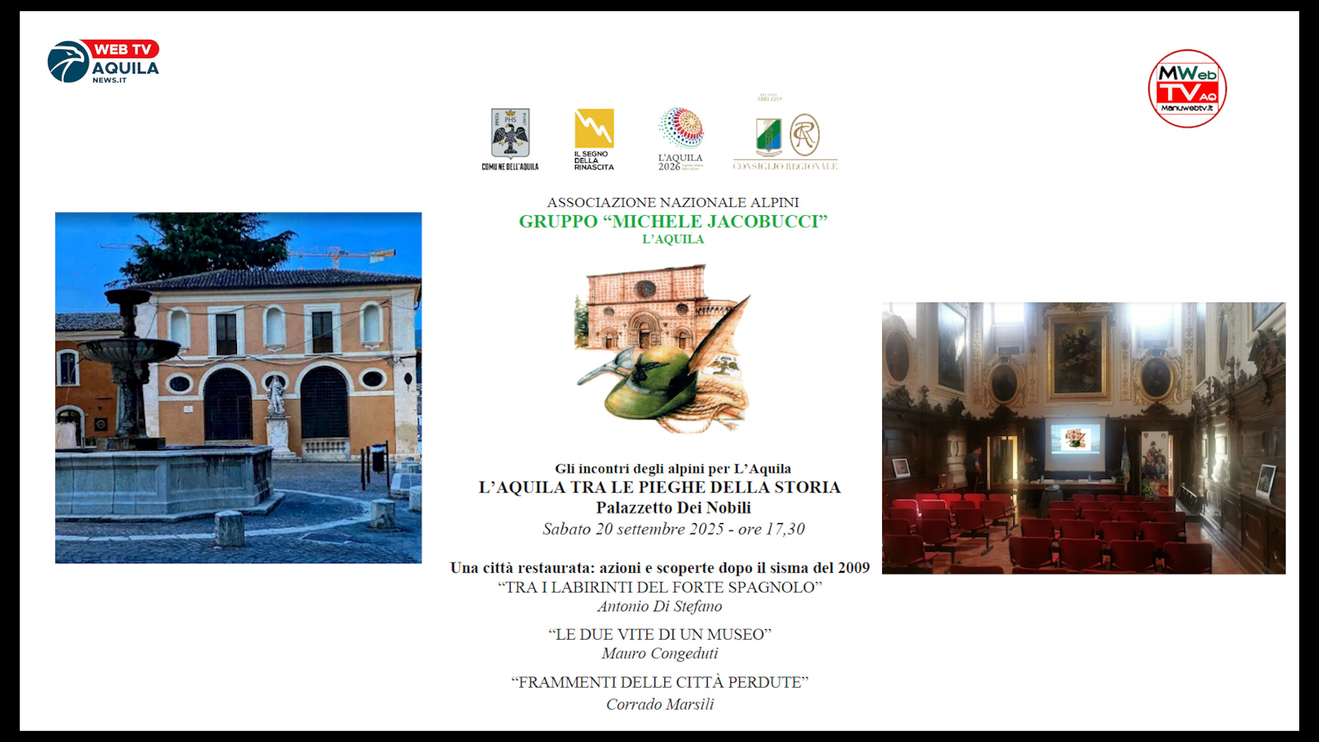 L’AQUILA – Torna dopo la pausa estiva, sabato prossimo 20 settembre alle ore 17:30 presso Palazzetto dei Nobili dell’Aquila, il programma che prevede una serie di conferenze organizzata dal Gruppo ANA “M. Jacobucci” dal titolo “Gli incontri degli alpini per L’Aquila”.
