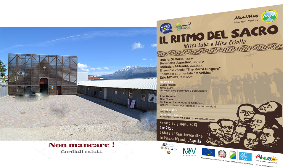 In occasione della manifestazione “Abruzzo Open Day Summer 2018”, giunta oramai alla 3° edizione, l’Associazione “MoviMus” – Movimento Musicale propone un evento originale, coinvolgente e di grande valenza multiculturale: “Il Ritmo del Sacro”, che avrà inizio alle ore 21.30 di sabato 30 giugno 2018 presso la Chiesa di San Bernardino in Piazza d’Armi. Alla guida dell’Ensemble vocale “The Karol Singers” e dell’Ensemble strumentale “MoviMus”, il M° Ezio Monti, direttore artistico dell’Associazione.