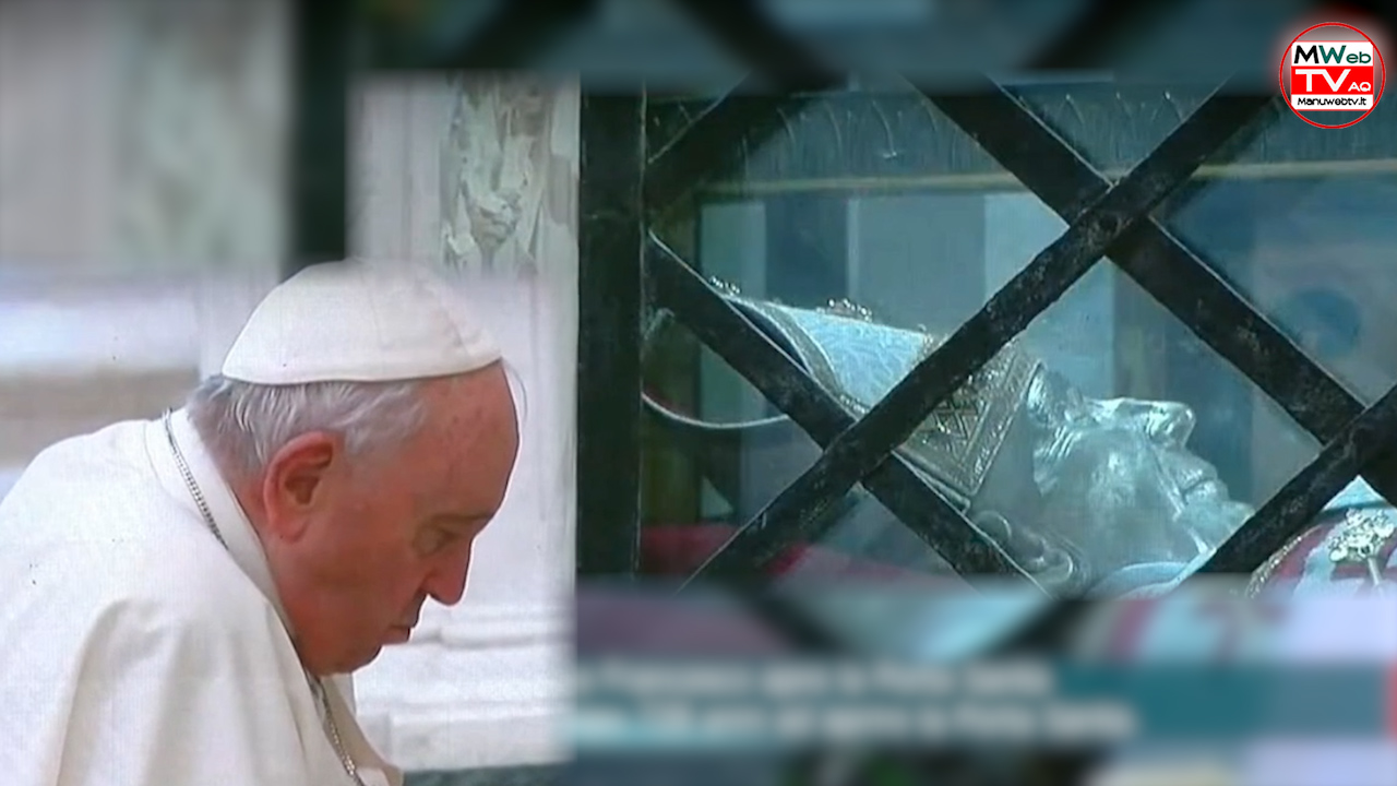 Papa Francesco prima di entrare nella basilica, recandosi a pregare davanti alle spoglie di Celestino V