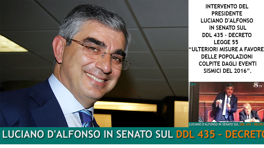 INTERVENTO del presidente LUCIANO D’ALFONSO IN SENATO SUL DDL 435 – DECRETO LEGGE 55 “ULTERIORI MISURE A FAVORE DELLE POPOLAZIONI COLPITE DAGLI EVENTI SISMICI DEL 2016”.