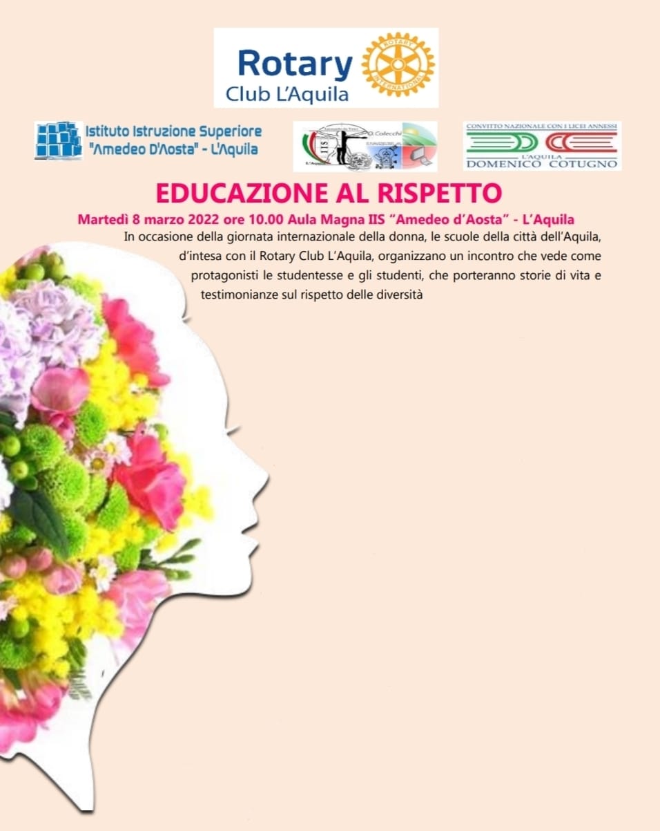LAquila: Martedì 8 marzo,  in occasione della giornata internazionale della donna, le scuole della città dell’Aquila, d’intesa con il Rotary Club L’Aquila, alle ore 10 presso l’aula magna dell’istituto Amedeo d’Aosta,  organizzano un incontro che vede come protagonisti le studentesse e gli studenti, che porteranno storie di vita e testimonianze sul rispetto delle diversità.