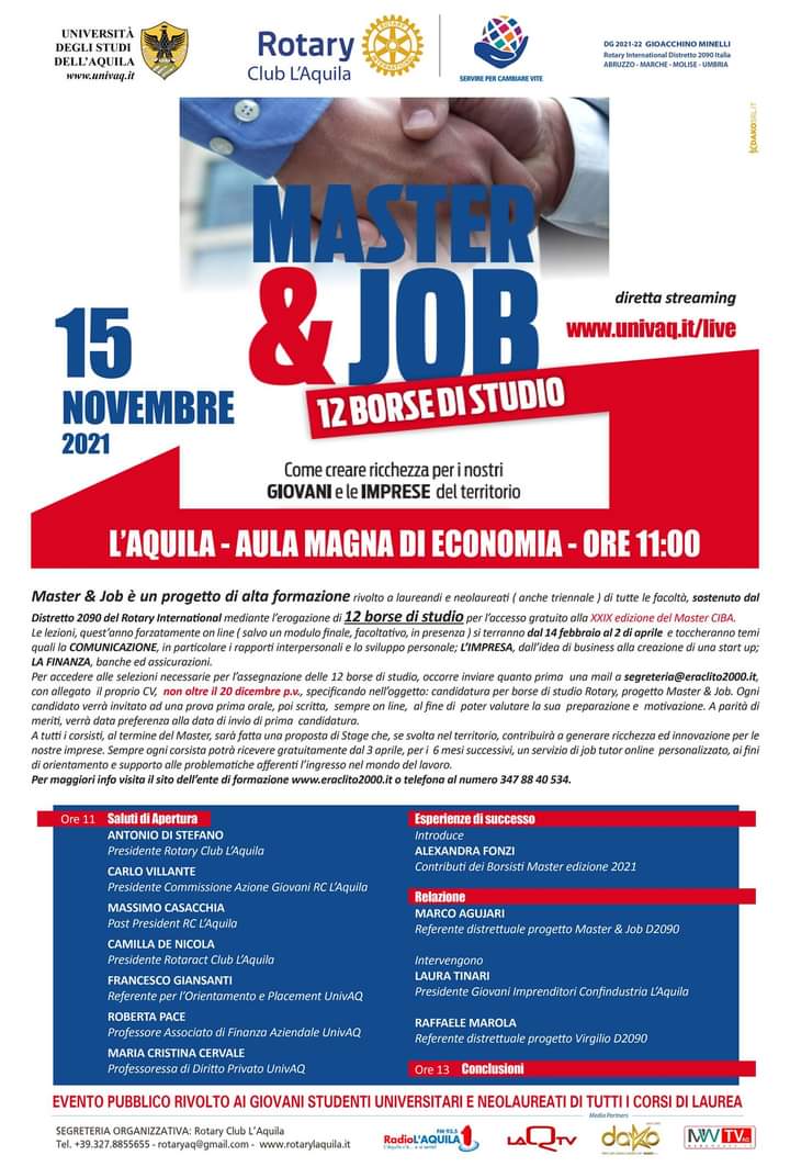 Lunedì prossimo, 15 novembre presso l’aula magna della facoltà di Economia dell’Università a partire dalle ore 11:00 si terrà il seminario, aperto ai giovani studenti universitari e neolaureati di tutti i corsi di laurea, “Master & Job, come creare ricchezza per i nostri giovani e le imprese del territorio” organizzato dal Rotary Club L’Aquila in collaborazione con l’Università degli studi dell’Aquila.